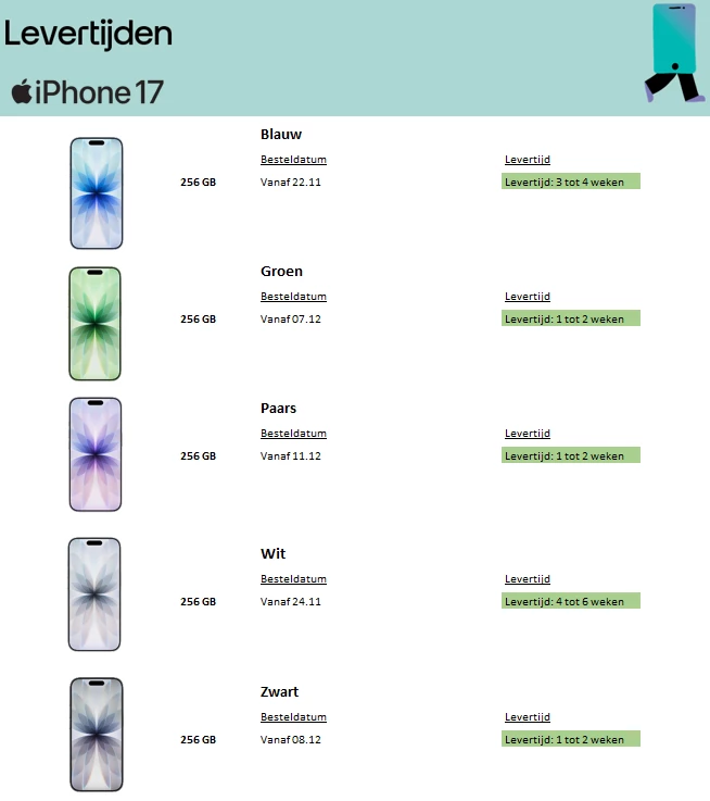 Heb je een iPhone 17 besteld? Dan vind je de levertijden in dit pdf bestand. Kies de kleur van je iPhone. Zoek je besteldatum op en bekijk daarachter de levertijd.